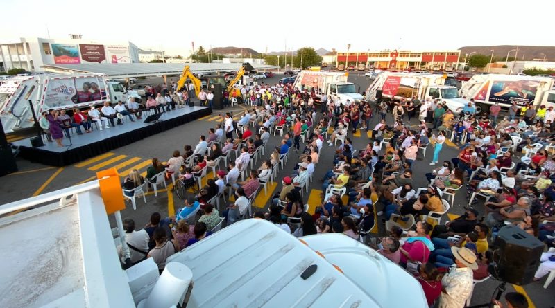 La Paz, Baja California Sur.- La Presidenta Municipal, Milena Quiroga Romero encabezó la entrega de 7 nuevos camiones de recolección