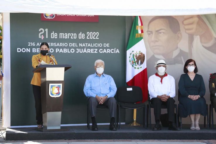 Durante su intervención, como oradora oficial, la Directora del Instituto Sudcaliforniano de las Mujeres (ISMujeres), señaló que Juárez marcó la historia y los principios de la sociedad en la que hoy se vive, fue defensor de la Patria y uno de los constructores de la soberanía.