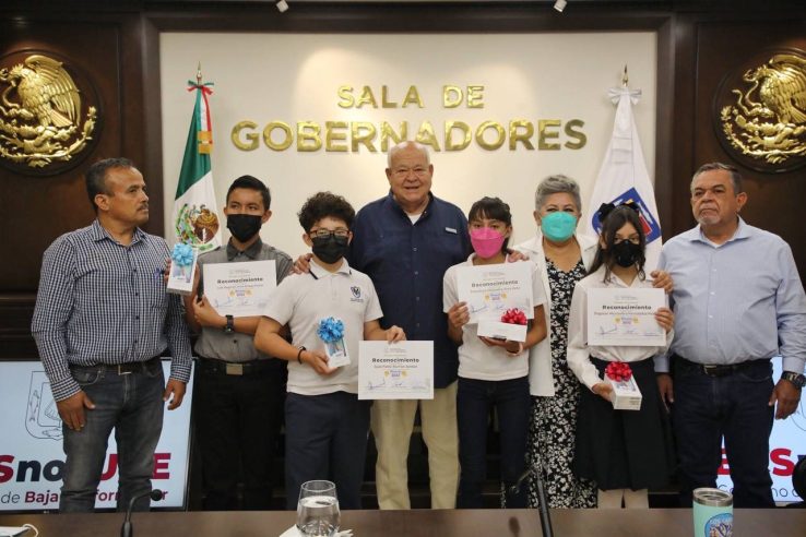La Paz, Baja California Sur.- Para reconocer su desempeño en la Olimpiada Estatal del Conocimiento Infantil 2022, el gobernador Víctor Castro Cosío, sostuvo un encuentro con los cuatro niños y niñas que resultaron ganadores de la competencia educativa. “Ustedes son el ejemplo de lo que se puede hacer cuando hay dedicación y entrega, deben conducirse siempre con respeto y honestidad”, señaló.