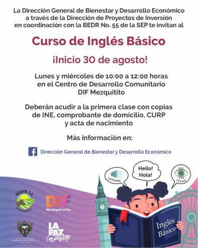 Debido a la vocación turística que predomina en la entidad y la importancia de manejar un segundo idioma, H. XVII Ayuntamiento de La Paz a través de la Dirección General de Bienestar y Desarrollo Económico, bajo la coordinación de la Dirección de Proyectos de Inversión, invitan a los cursos gratuitos de inglés básico e inglés especializado en atención al cliente que arrancan a finales de mes.