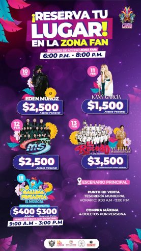 Todavía hay boletos disponibles, por lo que la invitación es que acudan a la explanada del Palacio Municipal, en un horario de 09:00 a 15:00 horas, en donde se instaló un módulo móvil específicamente para dar atención a todas las personas que acudan a comprar un boleto en la Zona Fan, para las próximas fiestas carnestolendas que se llevarán a cabo del 08 al 13 de febrero.