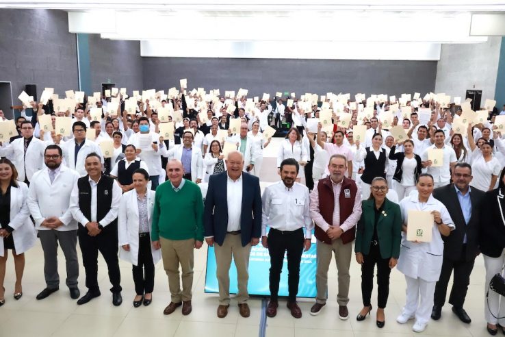 Durante la entrega simbólica realizada en el Centro de Convenciones de La Paz, el director general del Seguro Social, Zoé Robledo, y el gobernador Víctor Manuel Castro Cosío, encabezaron la entrega de 10 certificados de basificación en representación del personal de salud que laboraba en condiciones precarias y temporales.