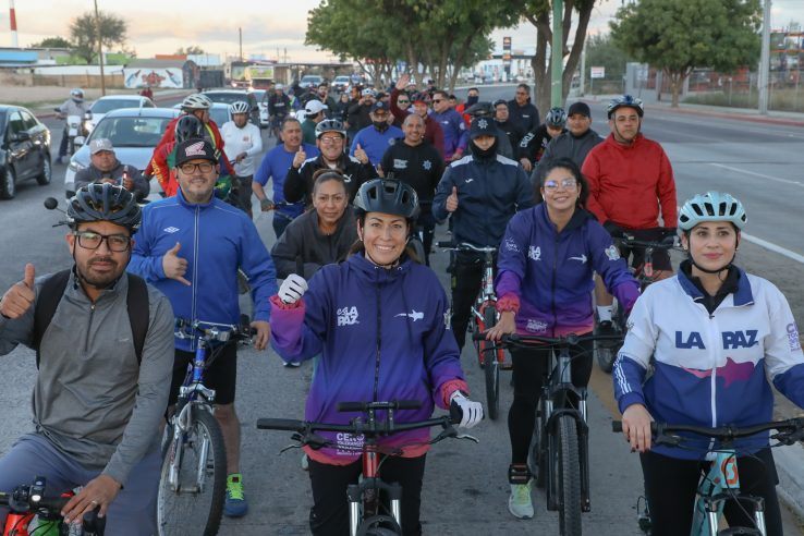 La presidenta municipal de La Paz, Milena Quiroga Romero, encabezó el primer Biciviernes de 2026, con la participación de trabajadoras y trabajadores de distintas áreas del Ayuntamiento de La Paz, así como la presencia del diputado local Erick Agúndez, como parte de las acciones para impulsar la activación física y una vida saludable en el municipio.