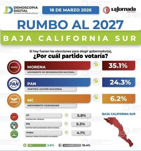 Según sondeos de diversas casas encuestadoras, el escenario político, rumbo a la gubernatura en Baja California Sur, es ampliamente favorable para el movimiento que encabeza Morena y sus a aliados el PT y el PVEM.