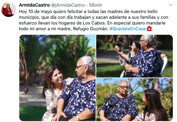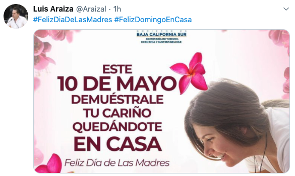 De una manera mas, sencilla el Secretario de Turismo, Economía y Sustentabilidad en BCS, Luis Humberto Araiza Lopez, publico en su cuenta de Twitter una imagen alusiva a la festividad, resaltando el llamado a mantenerse en casa en medio de la emergencia sanitaria y utilizando los hashtag #FelizDiaLasMadres #FelizDomingoEnCasa.